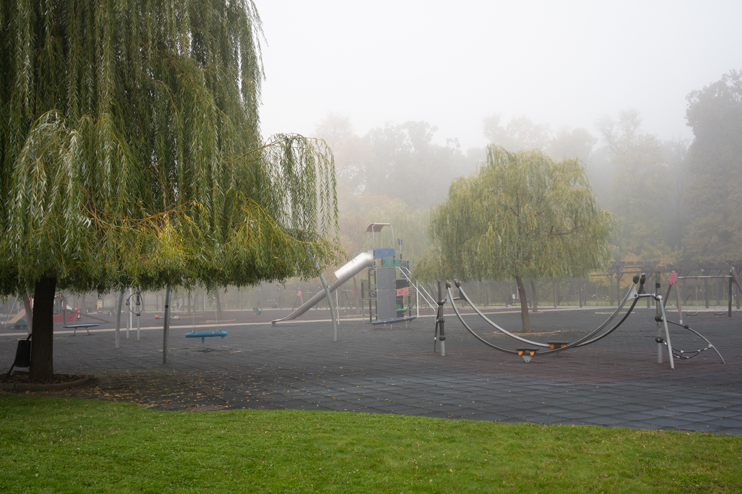 [ro] Romania, Craiova 2021, toamna cu ceaţă în Parcul tineretului, loc de joacă;