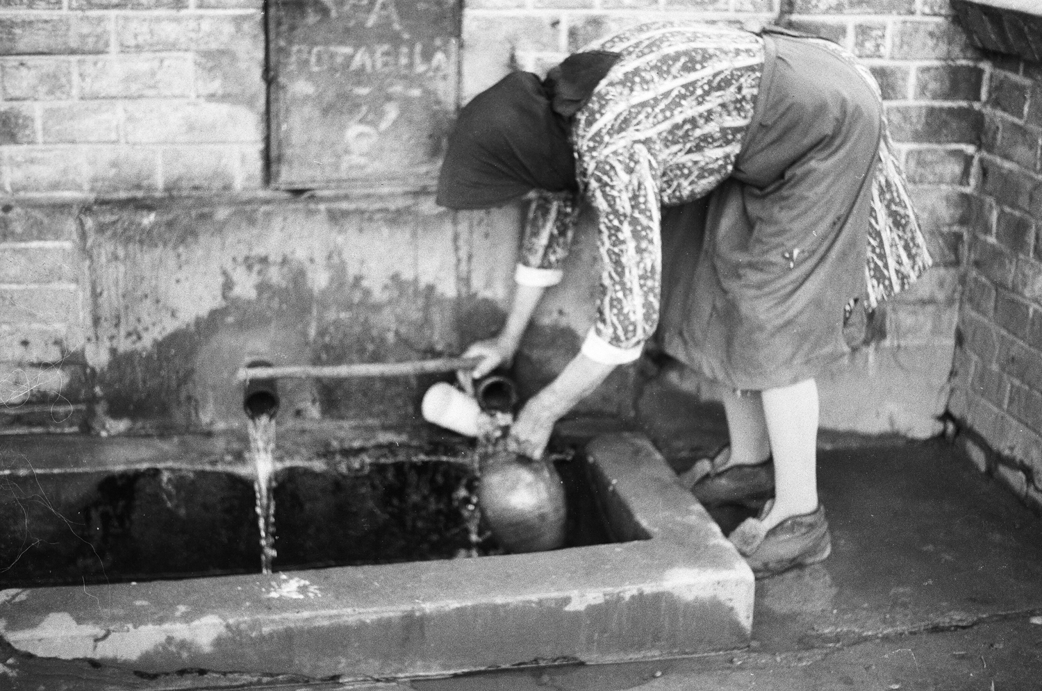 [ro]: Obiect digitizat: film negativ alb negru format 35mm, Romania, 1975, femeie la izvor umple un ulcior cu apa